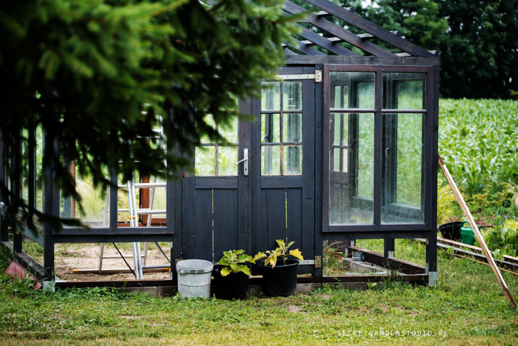 To efekt ostatniego dnia świąt Bożego Narodzenia A.D 2022 gdy nudziło mi się już tak bardzo, że wpadłam na genialny pomysł, żeby przenieść istniejącą szklarnię bliżej warzywniaka, a właściwie to zbudować nową na bazie dostępnych materiałów, w klimacie vintage. Moja wizja ewoluowała w tempie zatrważającym (szczególnie dla Boba, który został natychmiastowo obwołany głównym wykonawcą mojego projektu) a projekt został rozrysowany na 4 arkuszach bloku A3 (bez skali bo ja się nie znam na skalach) uwzględniając rozbiórkę dotychczasowej szklarni, wszystkie stare okna jakie walały się za szopą oraz drzwi od starej werandy i boazerię z demontażu. Wizja zawierała też kolor czarny lub co najmniej antracyt. Kto robi czarną szklarnię!!! – pukał się w czoło ze zgrozą Bob i wykrzykiwał że nie będzie brał w tym udziału.